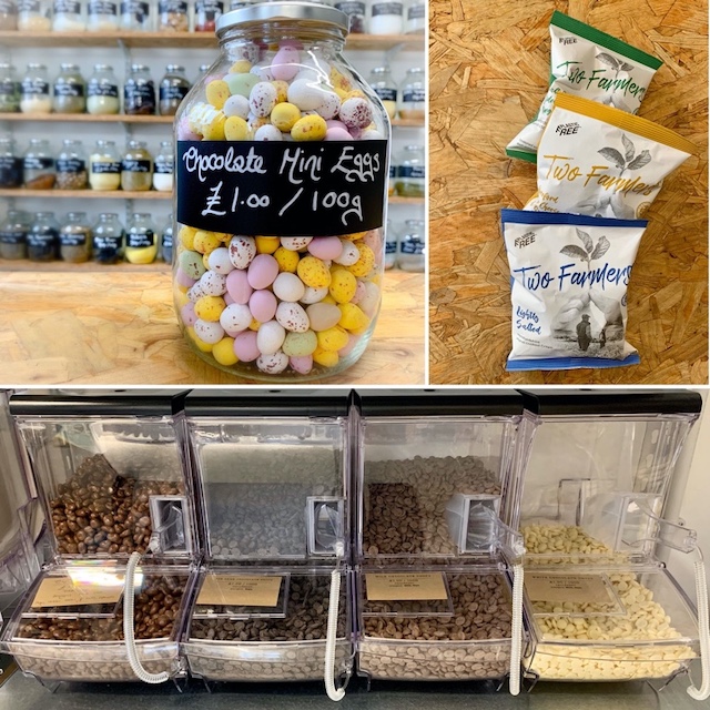 Chocolate and crisps - We all need a treat sometimes! So we stock a range of high quality Belgian chocolate drops, as well as delicious chocolate raisins, and crisps from Two Farmers which come in 100% home compostable packets!